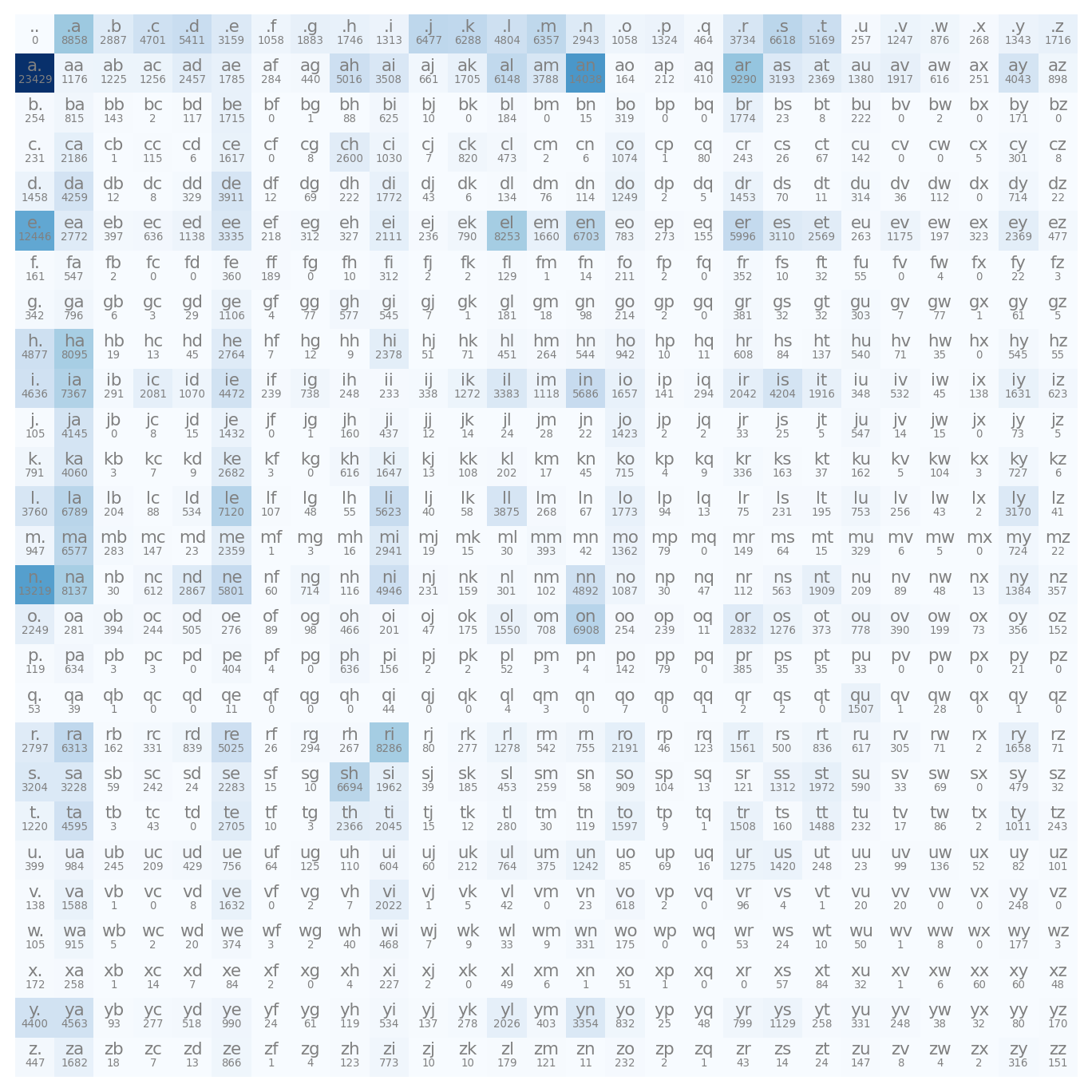 \[\mathrm P( m | . ) = \dfrac{C(.m)}{C(.)} \] \[\mathrm P( a | m ) = \dfrac{C(ma)}{C(m)} \] \[\mathrm P( t | a ) = \dfrac{C(at)}{C(a)} \] \[\mathrm P( t | t ) = \dfrac{C(tt)}{C(t)} \]